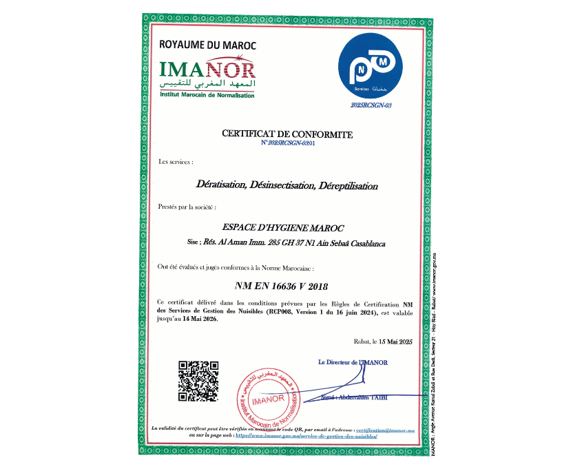 Nous sommes fiers d’être parmi les leaders nationaux en hygiène 3D (Dératisation, Désinsectisation, Déreptilisation ), grâce à la certification NM 16636, alignée sur la norme européenne EN 16636.